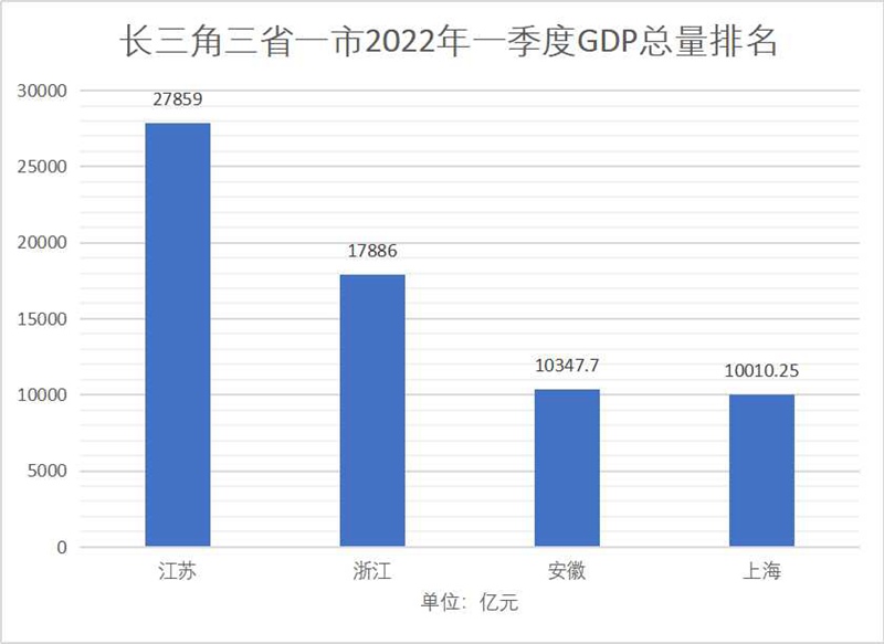 近日,長三角三省一市陸續公布了2022年一季度經濟運行情況。數據顯示,江蘇省一季度GDP達27859億元,同比增長4.6%;浙江省一季度GDP達17886億元,同比增長5.1%;安徽省一季度GDP達10347.7億元,同比增長5.2%;上海市一季度GDP達10010.25億元,同比增長3.1%。