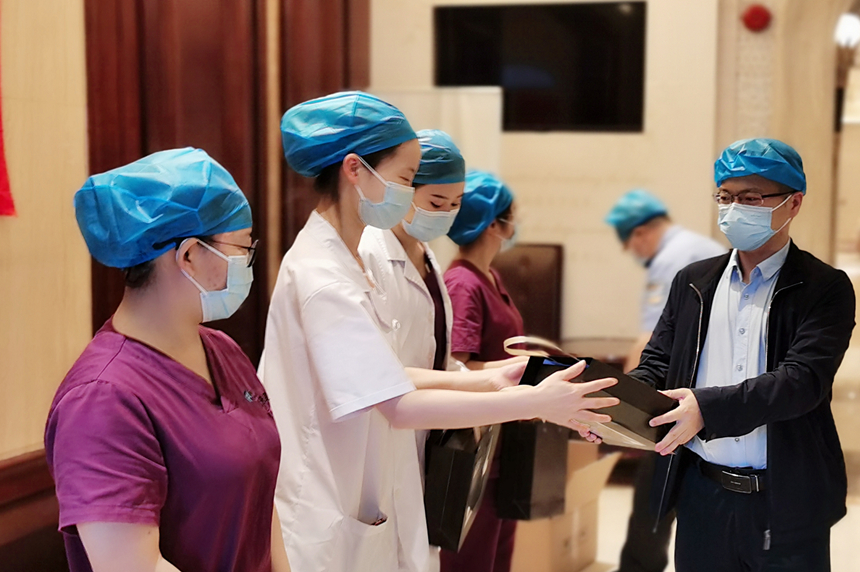 護士節到來之際,“點長”周斌(右一)為醫療組送上精心準備的禮物。王珺攝