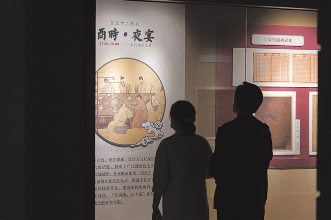 5月18日至7月18日,“苕上十二時辰——宋代湖式生活”特展在湖州市博物館舉辦。展覽以十二時辰為敘事主線,通過百余件宋代文物,還原宋人平凡的一天,再現古人日常風貌及風俗習慣,探尋其中蘊含的湖州氣息。圖為5月18日晚,市民參觀豐富多彩的展品。(伊凡)