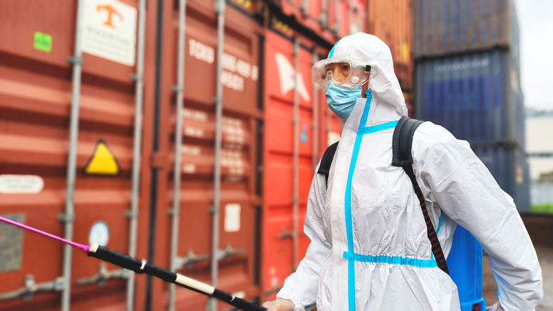 工作人員對貨運集裝箱開展例行消殺。俞璐攝