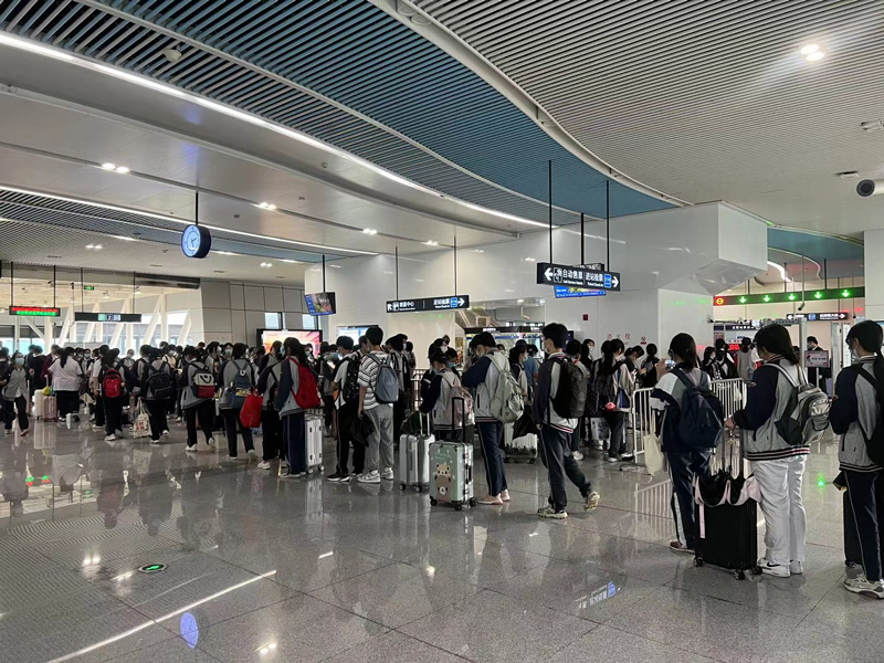 6月2日一大早,溫州軌道交通S1線各車站人頭攢動,進站測溫點處排起了長隊,客流在短時間內增加到近千人的峰值。由于周邊五所學校學生同時放假,端午“客流大軍”如約而至,甌華站客流全天突破三千人次。為維持站內的順暢秩序,幸福軌道公司通過與軌道公安及周邊學校的有效溝通,針對性加強了應對大客流的通行能力,從行車組織、客運組織、設備保駕、安全維穩、疫情防控等方面做好具體應對方案!跋裎覀儎榆嚹险臼谴罂土鹘煌屑~站,我們就會提前聯系高鐵站,對客流做一個總體分析和預判!避囌鞠嚓P負責人介紹。同時,車站提前在站廳非付費區擺上鐵馬及導流帶,不僅提高了站廳的利用率,也有效避免了購票排隊與過安檢排隊的乘客相互影響。