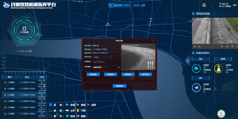 錢塘區率先打造“人—機動車—環境”多要素立體安全感知體系,形成“快速感知+全景認識+精準查控”的防潮安全網。在杭州市智慧防潮現場參觀交流活動中,錢塘區農業農村局副局長張建強介紹:“錢塘區擁有杭州市最長的防潮岸線,防潮管理任務繁重,適合采用數字化技防手段協助工作。目前,智慧防潮系統已經進行了升級,在二十工段2公里段內試點‘紅外對射觸發與熱成像球機’AI人體識別跟蹤技術,降低了盲區覆蓋成本、加大監控捕捉范圍、提高人與物體智能分辨準確率,可實現對翻越江堤行為的全過程監管!