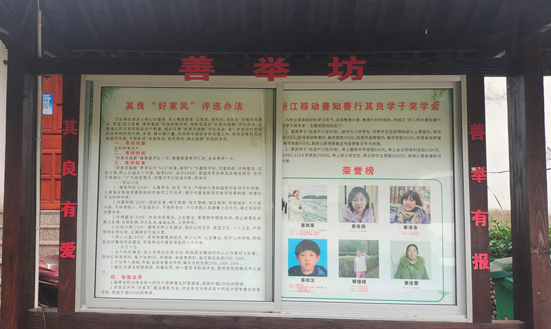 從2021年起,在浙江移動的指導與幫助下,其良村建立了以家風傳承為紐帶的“好家風”指數!昂眉绎L”指數評價體系將遵規守紀、鄰里和睦、環境整潔、垃圾分類、熱心公益等與村民息息相關的事項納入評價范圍,對村民的參與情況、日常表現進行量化打分,從支部到黨員到群眾層層落實,切實把村民組織起來,激發黨員+聯系農戶的網格新潛能,串聯起基層治理中的自治、德治、法治三個環節,營造人人參與、人人盡責的鄉村治理新格局。同時,為樹立其良良好的學習風氣,達到教育興家、教育興村的目的,其良村設立了“浙江移動善知善行其良學子獎學金”,為被評為優秀學生或考取高中、本科、研究生的其良學子提供獎勵,讓其良學子感受到村集體的關愛,激勵農村家庭關注子女教育,從而在全體村民中形成尊重教育、尊重知識、尊重人才的良好氛圍,也為家鄉的振興發展創造育才引才留才的有利條件。
