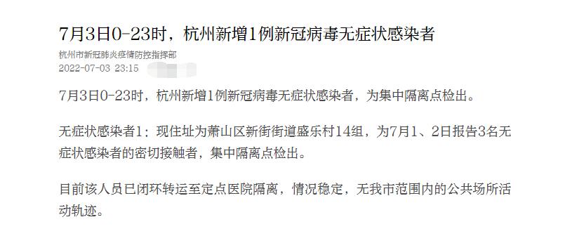 據悉,此前,7月1日0至14時,杭州新增2例新冠病毒無癥狀感染者,其中1例為常態化核酸檢測發現、1例為其密切接觸者;7月2日0至14時,杭州新增1例新冠病毒無癥狀感染者,為集中隔離點檢出。