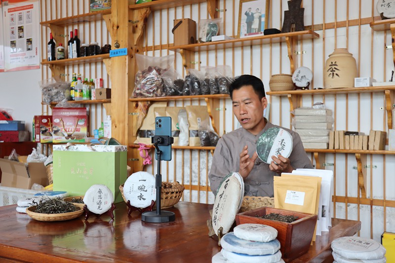 周道明在直播間向網友推薦茶葉,吆喝“帶貨”。吳謹江攝