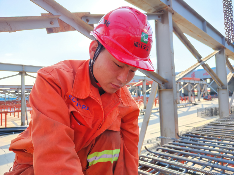在濱?;ネㄊ┕がF場,鋼筋班工人劉曉飛和他的工友們正在配合吊車,將加工好的墩身鋼筋籠與樁基預留鋼筋進行精準焊接?!颁摻罨\的安裝對于定位和精度要求非常高,雖然現在天氣熱,但是每一道工序、每一個操作我們都不能馬虎。只要工程干得好,我們辛苦點也值了?!眲燥w一邊認真仔細地校正鋼筋的位置,一邊用焊槍對鋼筋位置進行固定。