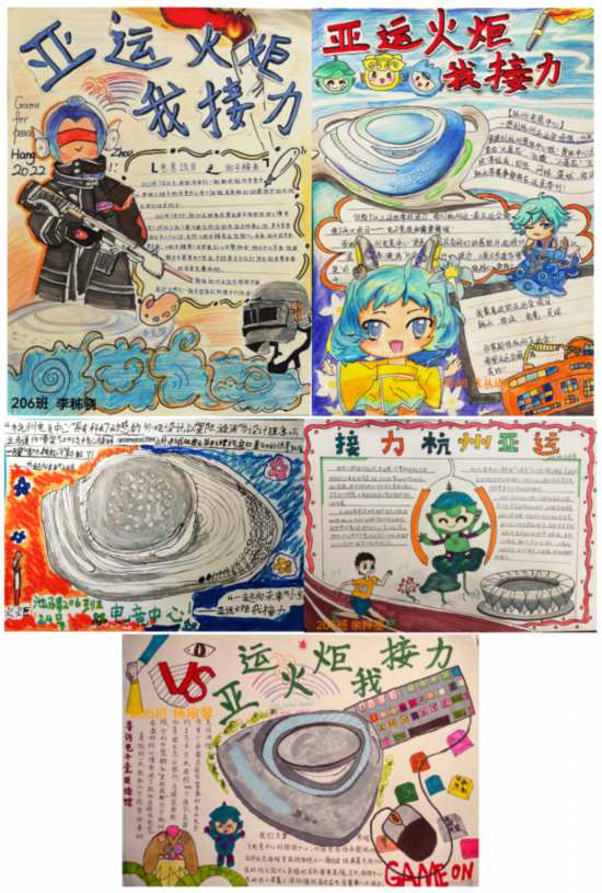 參觀完畢后的小隊成員們回來紛紛興致勃勃地畫起了手抄報,用自己的畫筆描繪出科幻和技術相結合的電競中心,也展現了他們對于亞運的渴望。