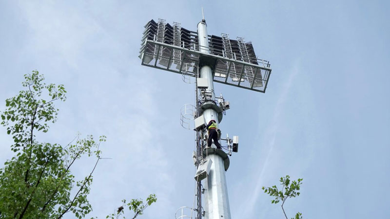 工作人員正在進行5G天線吊裝。浙江移動供圖