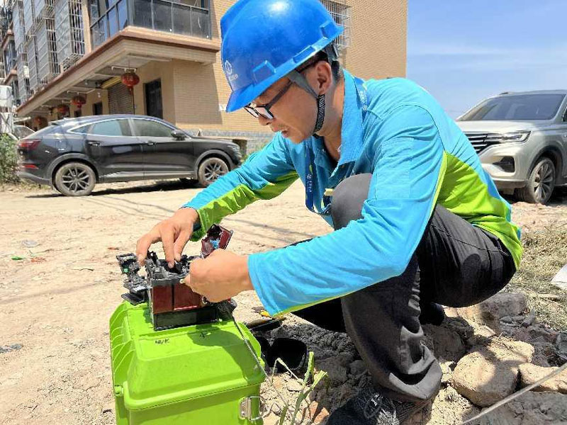 工作人員蹲在路邊進行光纖熔接。浙江移動供圖