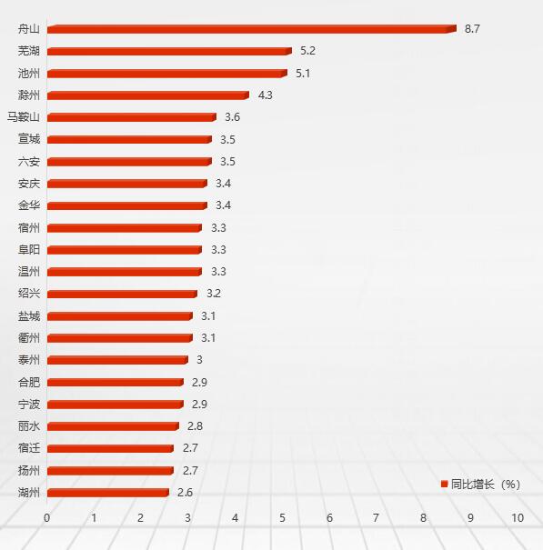 在增速榜單中,浙江舟山居第一,表現尤為亮眼,增速達到8.7%。