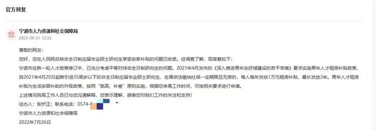 對此,寧波市人力資源和社會保障局有關負責人在回復中表示,寧波市在新一輪人才政策修訂中,已充分考慮了平等對待非全日制研究生的問題。2021年4月發布的《深入推進青年友好城建設的若干舉措》要求實施青年人才租房補貼政策,自2021年4月20日起新引進35周歲以下的非全日制應屆畢業碩士研究生,在甬依法繳納社保一定期限且無房的,每人每年發放1萬元租房補貼,最長發放3年。青年人才租房補貼為生活安居補助的升級政策,按照“就高、補差”原則實施。