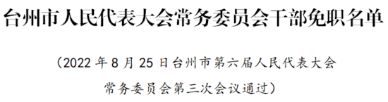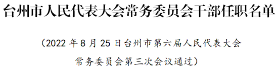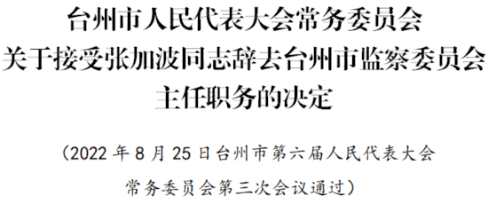 根據《中華人民共和國地方各級人民代表大會和地方各級人民政府組織法》《中華人民共和國監察法》《臺州市人民代表大會常務委員會人事任免辦法》的有關規定,臺州市第六屆人民代表大會常務委員會第三次會議決定:接受張加波同志辭去臺州市監察委員會主任職務的請求,報臺州市第六屆人民代表大會備案。