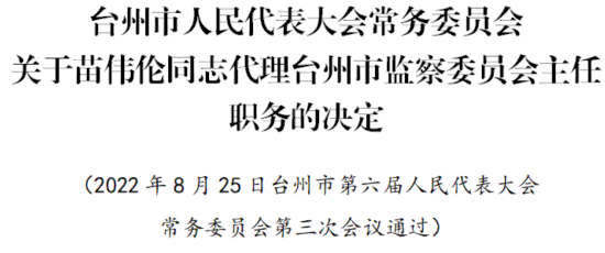 根據《中華人民共和國地方各級人民代表大會和地方各級人民政府組織法》《中華人民共和國監察法》《臺州市人民代表大會常務委員會人事任免辦法》的有關規定,臺州市第六屆人民代表大會常務委員會第三次會議決定:苗偉倫同志代理臺州市監察委員會主任職務。