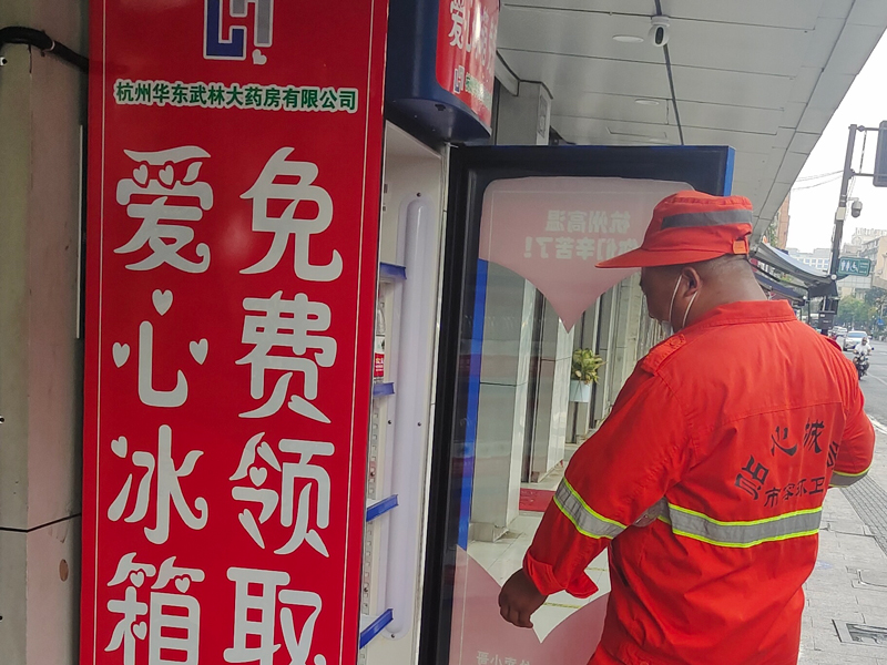“高溫天氣能喝上一口冰水,真的太方便了!”近日,一臺醒目的紅色冰柜出現在杭州拱墅區武林街道一處藥店門口,冰柜上寫著“愛心冰箱,免費領取”等字樣,吸引了不少過路人駐足。