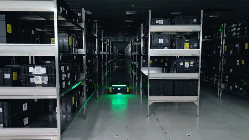 來到大華“未來工廠”的“無人倉儲”,仿佛誤入科幻電影的拍攝現場。與傳統車間里人員忙碌、燈火通明的景象不同,偌大的儲藏間里一片昏暗,透過微弱的自然光線,依稀可以看到,進進出出的AGV小車在有條不紊地把半成品運送、碼放和對接分發。