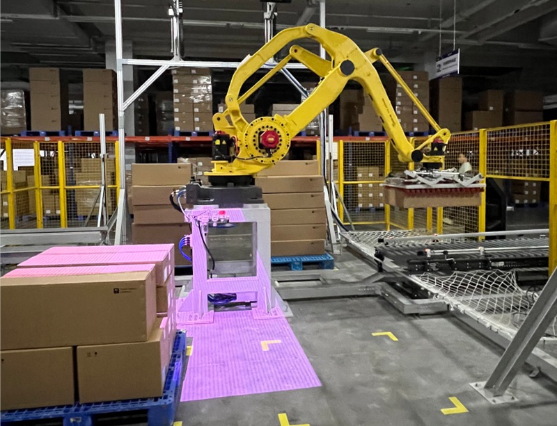 伸縮臂式機械手自動將貨品進行拆垛碼放。浙江大華股份供圖