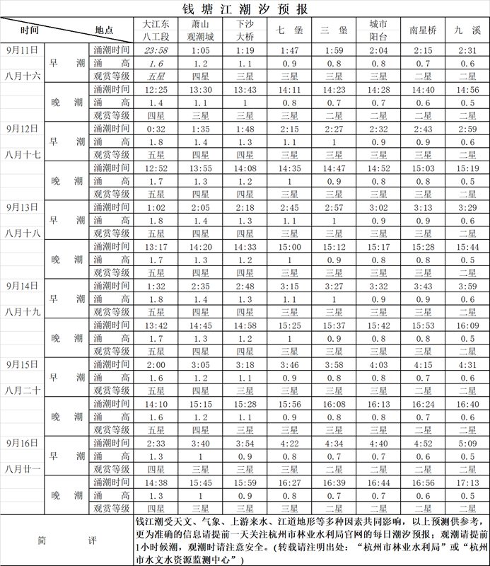 以倉前水文站為基準:一星、二星為小潮汛,觀賞效果較差;三星為中潮汛,觀潮效果一般;四星、五星為大潮汛,觀賞效果最佳。