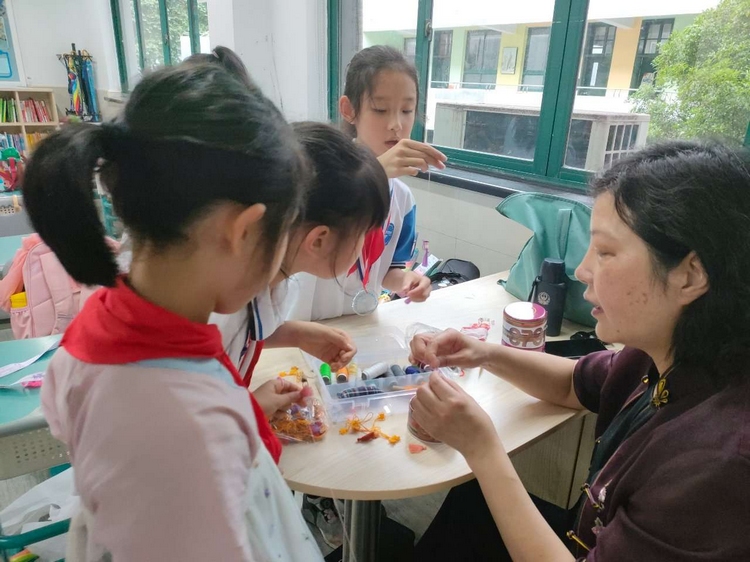 在杭州西湖小學,老師教學生穿絲線。受訪者供圖