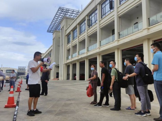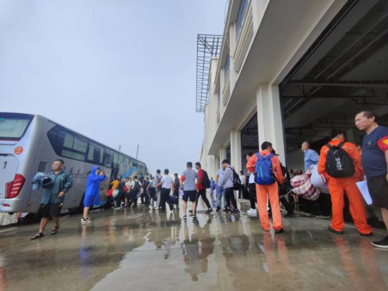 9月4日上午7時50分左右,在舟山綠色石化基地浙石化消防總站,島上中小型企業的4000余名務工人員,從這里集中出發轉移至舟山岱山本島。同一時間,在岱山縣小魚山15號營地一公司,該企業按照網格化管理,自行開展人員離島轉移工作。