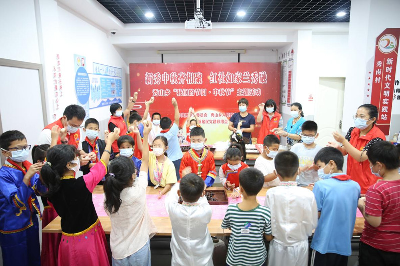 9月7日,秀山鄉“紅社如家”新居民黨建聯絡點黨員志愿者組織新居民子女開展做月餅活動。岱山縣委宣傳部供圖