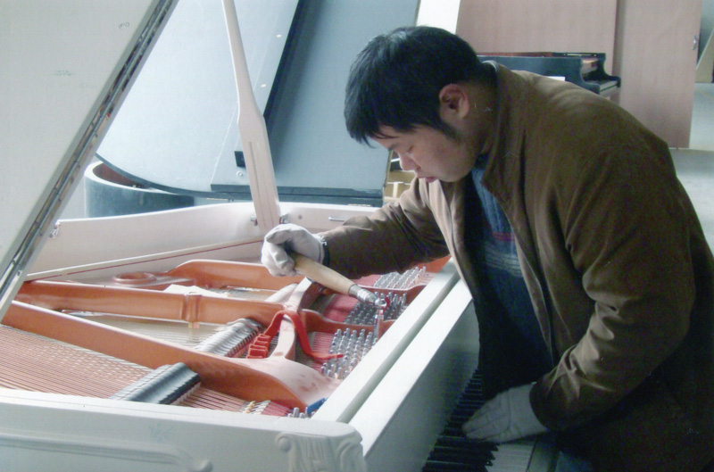 畢業后,波波應聘到杭州一家鋼琴廠工作。那時只有人工掛弦,每架鋼琴213根琴弦,波波一天要撥14架;每架鋼琴要調7次,才能出廠……從學習基礎的撥音到成為一名合格的調律師,在那個滿是灰塵的嘈雜的工廠里,波波一干就是3年。其間,他還去廣州參加了考試,并順利拿到了調律師資格證。