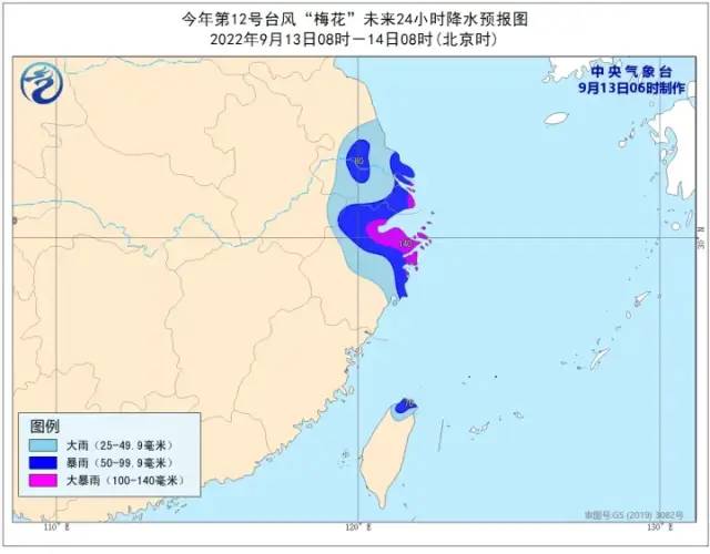 降水預報:9月13日08時至9月14日08時,臺灣島北部、浙江北部、上海、江蘇東南部等地將有大到暴雨,其中浙江東北部和上海等地的部分地區有大暴雨(100—140毫米)。