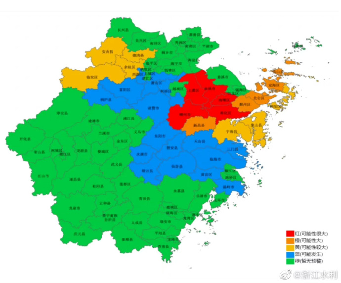浙江省水利廳、浙江省氣象局2022年9月13日7時35分聯合發布山洪災害紅色預警。預計9月13日8時至9月14日8時,寧波海曙區、奉化區、余姚市,紹興上虞區、嵊州市發生山洪災害可能性很大(紅色預警);寧波北侖區、鄞州區,紹興新昌縣,舟山定海區、岱山縣發生山洪災害可能性大(橙色預警);杭州余杭區、臨安區,寧波象山縣、寧??h,湖州德清縣、安吉縣,舟山普陀區發生山洪災害可能性較大(黃色預警);杭州西湖區、蕭山區、富陽區、桐廬縣,紹興柯橋區、諸暨市,金華磐安縣、東陽市、永康市,臺州黃巖區、三門縣、天臺縣、仙居縣、溫嶺市、臨海市,麗水縉云縣可能發生山洪災害(藍色預警)。請密切關注天氣形勢及雨水情變化,注意防范強降水引發的山洪災害。