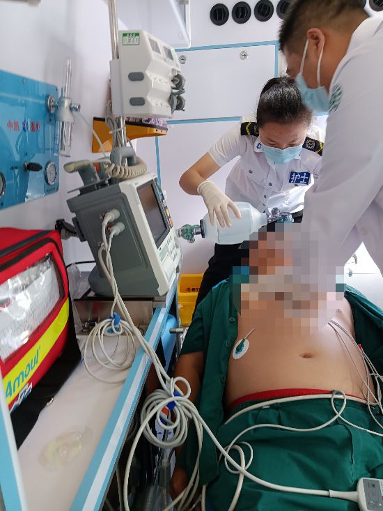 以往,救護車僅承擔簡單的院前救治和病患搬運工作,但現在,救護車也成了將病人從死亡線上拉回的第一道“守關人”。2022年5月27日12點46分,龍港市120急救指揮中心接到群眾報警:“華潤電廠有個胸悶伴抽搐的患者,需要120救護車?!迸u艚站點接到急救任務,醫生薛明明、護士謝小雁、駕駛員陳慶樓12點47分出車,一路飛馳,13點01分到達急救地點。當時患者已抽搐暈厥、心跳微弱,將患者搬上救護車后,薛明明第一時間為他進行心電圖檢查,屏幕上的直線更是表明了情況十分危急。薛明明和謝小燕立刻為患者進行胸外按壓、電除顫操作,經過不懈努力將患者暫時從“鬼門關”拉了回來,但危險并沒有解除。