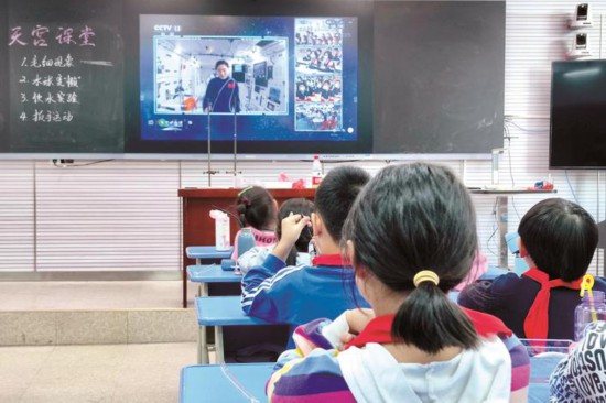 10月12日下午,“天宮課堂”第三課在中國空間站正式開講,神舟十四號飛行乘組航天員陳冬、劉洋、蔡旭哲面向廣大青少年進行太空授課,這是中國航天員首次在問天實驗艙內進行授課。嘉興平湖市一學校學生通過直播形式觀看,并參與了一場天地同步實驗,感知宇宙的奧秘,體驗探索的樂趣。(王蓉)