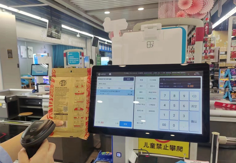 消費者買單時,超市收銀員掃描商品包裝上的“浙食鏈”二維碼就能完成結算。杭州市市場監管局供圖