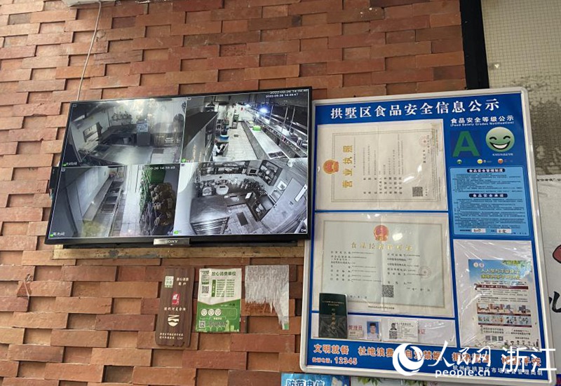 飯店門口墻上的大屏幕里,酒店后廚情況一清二楚。人民網 方彭依夢攝