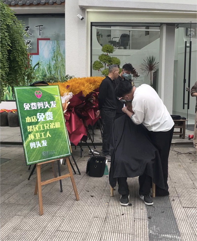 說干就干!廖雄帶著店里的學徒一起,在理發店門口立起了一塊醒目的招牌——“本店免費幫民工兄弟和環衛工人剪頭發”。