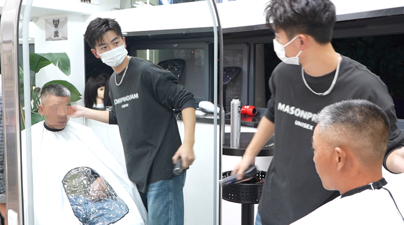 廖雄與學徒一起,免費幫民工兄弟和環衛工人剪頭發。留辰攝
