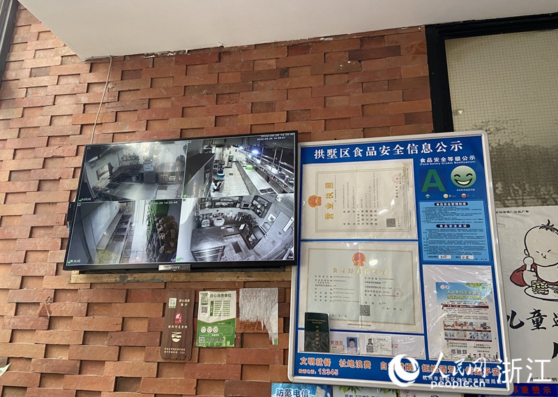 青菁酒家門口墻上的大屏幕里,可以清楚看到該酒店后廚的情況?!懊朗辰侄嗉疑虘粼谶M門顯著位置都設有食品安全信息觸摸式看板,公開商戶量化分級、行政處罰、員工健康信息、放心消費、陽光廚房等內容?!焙贾菔泄笆麉^市場監管局餐飲服務監管科科長聶蘇紅介紹,街區實行商戶信息全公開,根據商戶12個月內食品安全情況,對每家商戶量化分級進行動態等級評定,分為A級(良好)、B級(一般)、C級(較差)三個等級,便于消費者放心選擇。