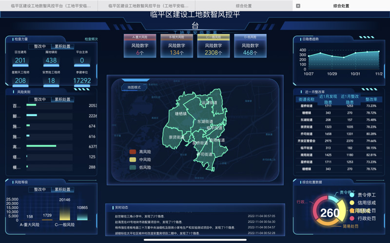 從發現隱患到處理隱患,如此快速且高效的處理結果源于“臨平區建設工地數智風控平臺”的投入使用。該平臺覆蓋全區的建設工地,從平臺界面上可以清晰看到工地平安“零距離”的風險等級、整改率、綜合處置數據、實時動態等信息,工作人員在線上就可以實時掌握全區建設工地的安全情況。截至目前,通過建設工地數智風控平臺已累計處置18139條安全生產隱患問題。