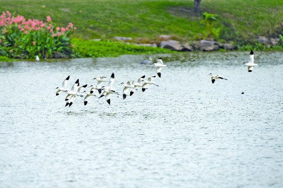 近日,金華市區面積最大的濕地——湖海塘公園水面上,一群遷徙來的反嘴鷸自由飛翔,和岸邊秋色構成一幅美麗的生態畫面。近年來,隨著周邊生態環境不斷改善,每年10月以后,市區湖海塘公園濕地都會吸引灰雁、白額雁、白琵鷺、小天鵝等候鳥前來棲息。(胡肖飛)
