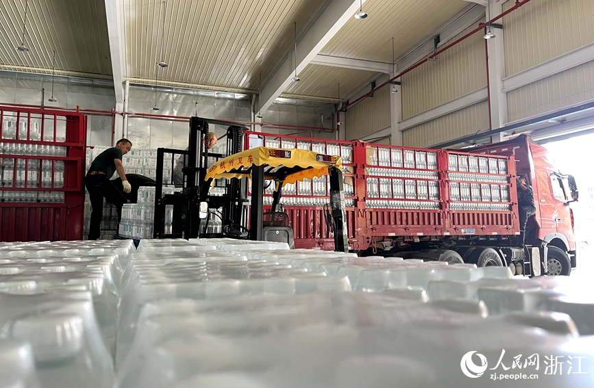 工人正將一箱箱“麗水山泉”礦泉水裝車。人民網記者 張麗瑋攝