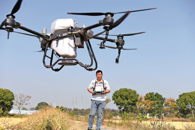 11月10日,在嘉興市秀洲區新塍鎮陡門村,50多歲的種糧大戶朱金芳操控著無人機在播種冬小麥,120畝連片土地僅用了兩小時便播種完畢,相比之前的傳統播種方式大大提高了工作效率。據悉,朱金芳目前承包了600畝土地,無人機已成為他離不開的“神器”。(馮玉坤)