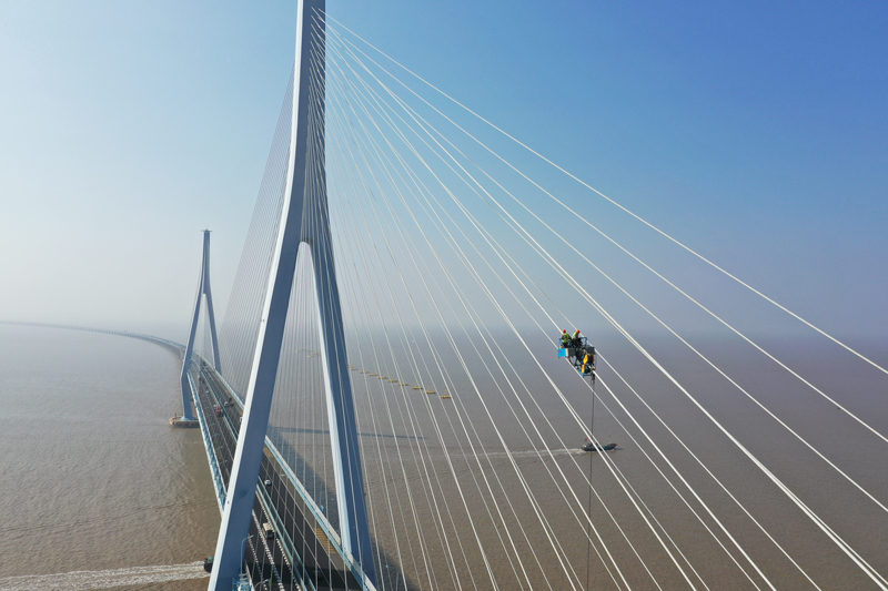 11月10日,浙江省交通集團高速公路舟山管理中心養護工程師正在金塘大橋上組織開展斜拉索螺旋線修復工作,兩名班組工人沿著斜拉索緩慢爬升作業,將螺旋線纏繞在斜拉索上。作為今年橋梁專項養護的重點工作之一,舟山管理中心的“橋梁醫生”以“望聞問切,尋醫問診,對癥下藥”為宗旨,深入排查結構風險隱患,延續大橋“生命線”,為司乘安全出行保駕護航。