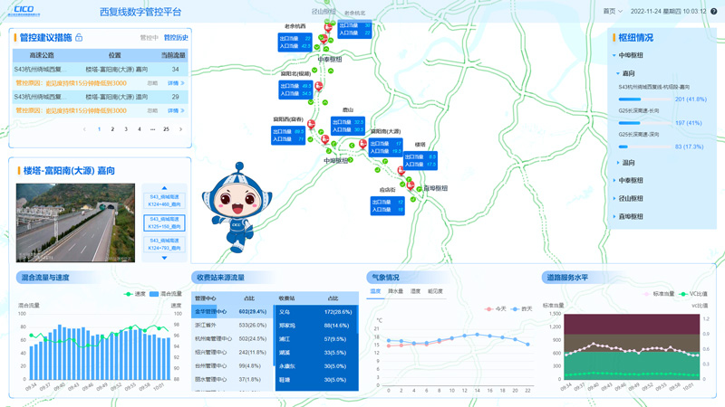 據了解,該平臺主要包括管控建議措施、實時道路視頻、混合流量與速度、氣象情況、道路服務水平等功能。當出現路段大流量擁堵、惡劣天氣等影響道路通行的情況時,系統會自動給出相應的管控建議措施并推送給運行分中心和屬地交警。