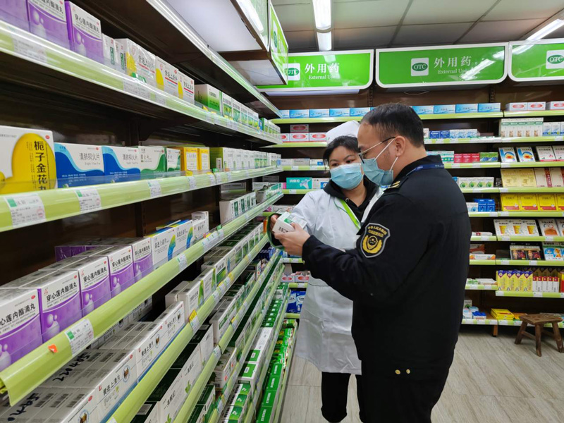 檢查藥店內所售藥品。龍灣區委宣傳部供圖