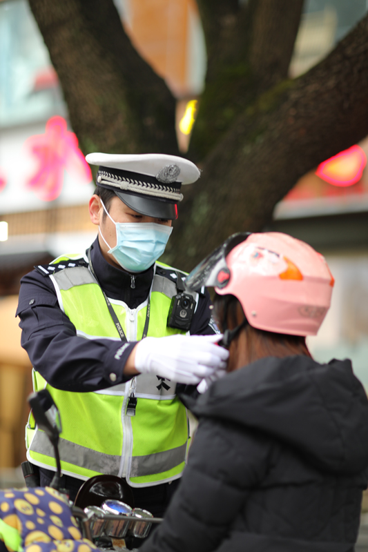 交警為電動車駕駛人戴好頭盔。陳凱攝