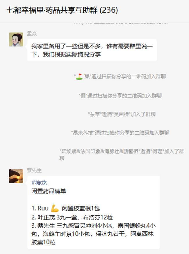 “起初我們也擔心群里求藥的多、愿意贈藥的少,但發現大家還是比較熱心的,目前市面上比較難買的藥也有居民愿意提供?!焙砺墩f。