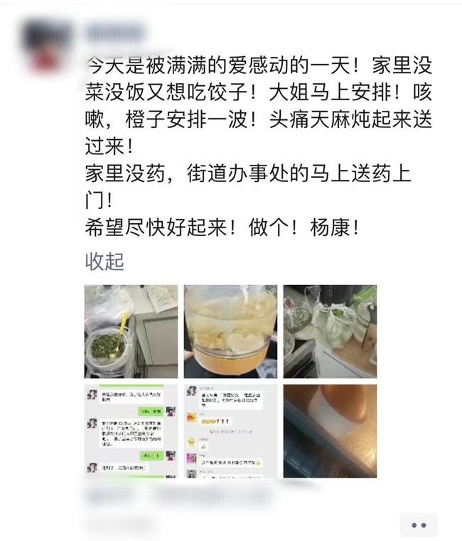 “今天是被滿滿的愛感動的一天……家里沒藥,街道辦事處的馬上送藥上門!希望盡快好起來!”拿到藥后,瞿女士發了條朋友圈,分享這份溫暖。