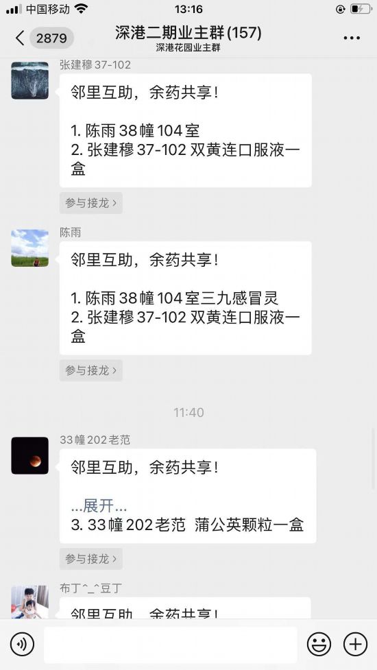 “三九感冒靈一盒”“雙黃連口服液一盒”“小兒氨酚黃那敏顆粒一盒”“板藍根沖劑一包”……12月19日中午,樂清樂成街道西岑社區“深港二期業主群”里,一條“鄰里互助 余藥共享”藥品清單的接龍越接越長,“接”出了特殊時期鄰里之間滿滿的安全感。