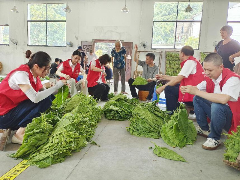 “香溢”志愿者們在仙巖鎮日溪坑村開展助農穿煙葉晾曬活動。張曉燕攝
