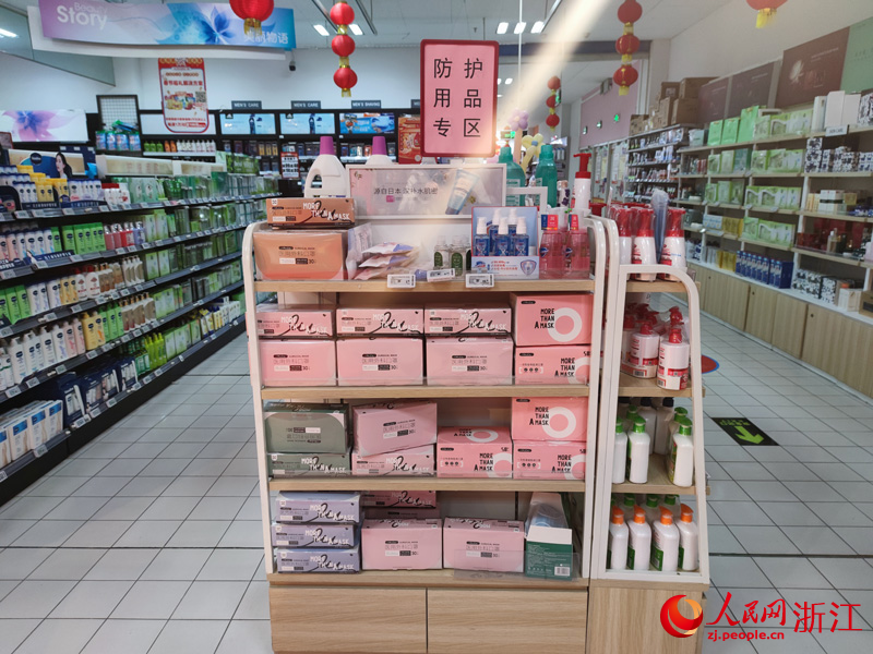 1月16日,人民網浙江頻道實地走訪了杭州市內多家商超、藥店發現,口罩、消毒水、酒精、免洗洗手液等防疫物資,普遍被擺放在了門口的顯眼位置,前來購買囤貨的市民絡繹不絕。