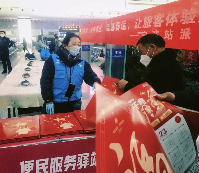 2023年春運第一天,寧波火車站人頭攢動。浙江移動寧波海曙分公司青年黨員志愿者放棄休假時間,主動“上崗”春運第一線,助力春運“送溫暖”活動。他們不斷穿梭在旅客中間,提供站場指引、信息咨詢、移動業務辦理等志愿服務,并為旅客們派送新春“禮包”,包括姜茶、防疫物資、移動福利業務等。志愿者們還給旅客們送上了充滿美好寓意的新春對聯、“?!弊趾图t包,溫暖旅客們的回家之路。
