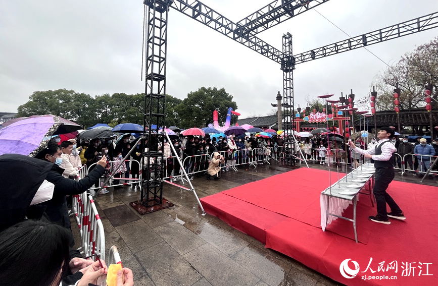 “好!”“牛!”1月23日中午1點,紹興安昌古鎮游客中心廣場不時傳來叫好聲。撥開人群,一名雜技演員正在表演轉碟子,十余個碟子在雜技演員巧妙操作下同時旋轉著。