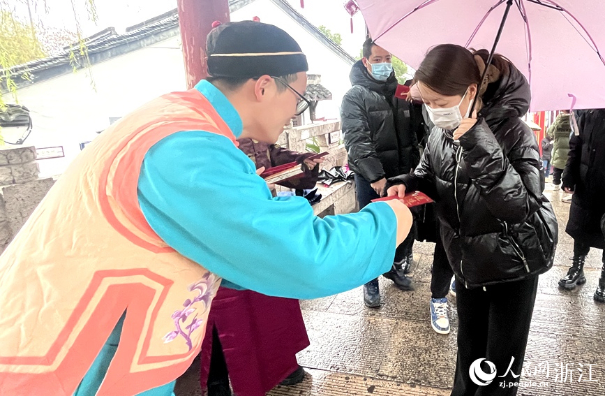 “紹興師爺”為游客派發新年祝福紅包。人民網記者 張麗瑋攝